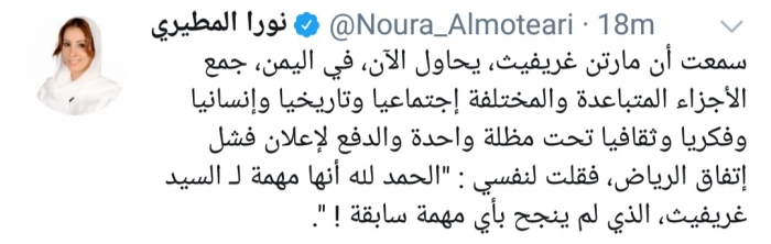 سخرت الباحثة السياسية نورا المطيري، من المبعوث الأممي لدى اليمن مارتن جريفيث.