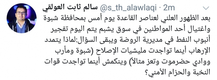 وكتب العولقي، في تغريدة له عبر موقع التواصل الاجتماعي تويتر، تابعها المشهد العربي: "بعد الظهور العلني لعناصر القاعدة يوم أمس بمحافظة شبوة واغتيال أحد المواطنين في سوق يشبم يتم اليوم تفجير أنبوب النفط في مديرية الروضة".