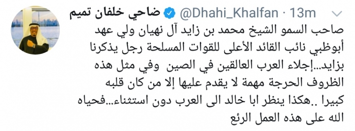 أشاد نائب رئيس الشرطة والأمن العام في دبي ضاحي خلفان تميم، بإجراءات الإمارات بشأن العرب المقيمين في الصين.