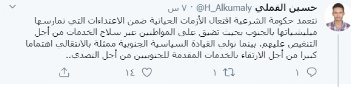 وكتب القملي عبر "تويتر":"تتعمد حكومة الشرعية افتعال الأزمات الحياتية ضمن الاعتداءات التي تمارسها مليشياتها بالجنوب بحيث تضيق على المواطنين عبر سلاح الخدمات من أجل التنغيص عليهم".