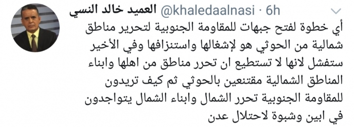 وكتب النسي، في تغريدة له على موقع التواصل الاجتماعي تويتر، تابعها المشهد العربي: "أي خطوة لفتح جبهات للمقاومة الجنوبية لتحرير مناطق شمالية من الحوثي هو لإشغالها واستنزافها وفي الأخير ستفشل لأنها لا تستطيع أن تحرر مناطق من أهلها وأبناء المناطق الشمالية مقتنعين بالحوثي".