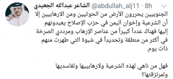 استنكر الشاعر عبدالله الجعيدي، تواجد عناصر الإرهاب في مناطق جنوبية وتحديدا في شبوة.