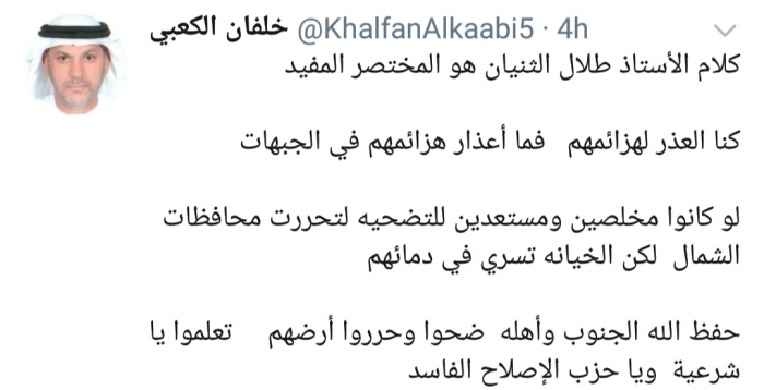 وكتب الكعبي، في تغريدة له على موقع التواصل الاجتماعي تويتر، تابعها المشهد العربي: "كنا العذر لهزائمهم فما أعذار هزائمهم في الجبهات.. لو كانوا مخلصين ومستعدين للتضحية لتحررت محافظات الشمال لكن الخيانة تسري في دمائهم".