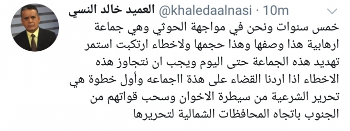 وكتب النسي، في تغريدة له على موقع التواصل الاجتماعي تويتر، تابعها المشهد العربي: "خمس سنوات ونحن في مواجهة الحوثي وهي جماعة إرهابية هذا وصفها وهذا حجمها".