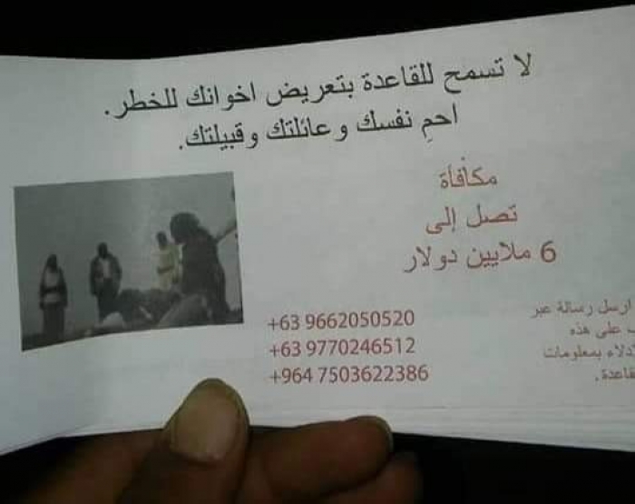 واحتوت المنشورات الملقاة وفقا للمصادر، على صوراً لعناصر قيادية من تنظيم القاعدة الإرهابي وأرقاما للاتصال بها أو إرسال رسائل عبر الواتساب للإدلاء بأية معلومات.