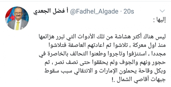 وكتب الجعدي، في تغريدة له على موقع التواصل الاجتماعي تويتر، تابعها المشهد العربي: "ليس هناك أكثر هشاشة من تلك الأدوات التي تبرر هزائمها منذ أول معركة".