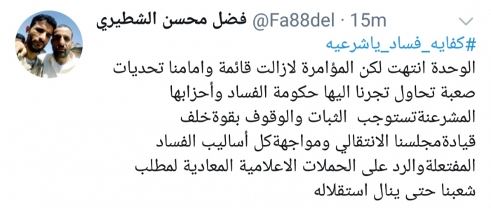 تفاعل رئيس دائرة الشباب بالمجلس الانتقالي الجنوبي فضل محسن الشطيري، مع هاشتاج "كفاية فساد يا شرعية".