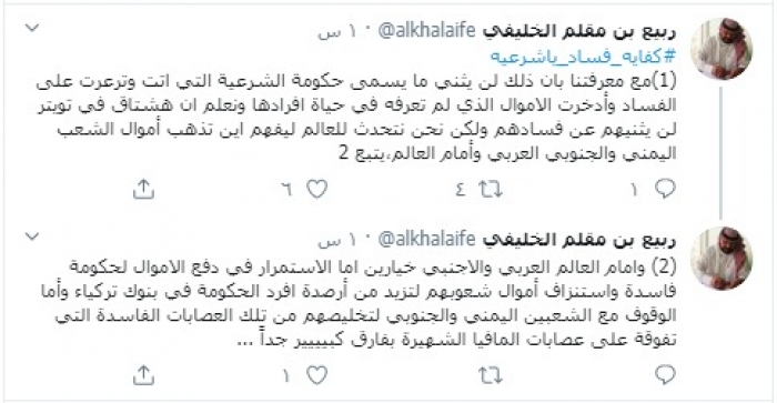 وكتب "الخليفي" في تغريدة بحسابه عبر موقع التواصل الاجتماعي تويتر، رصدها "المشهد العربي" قال فيها: "مع معرفتنا بأن ذلك لن يثني ما يسمى حكومة الشرعية التي أتت وترعرعت على الفساد وادخرت الأموال الذي لم تعرفه في حياة أفرادها ونعلم أن هشتاق في تويتر لن يثنيهم عن فسادهم ولكن نحن نتحدث للعالم ليفهم أين تذهب أموال الشعب اليمني والجنوبي العربي وأمام العالم".