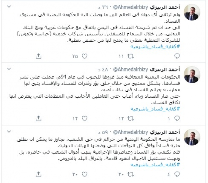 أوضح "الربيزي" في تغريدته الأولى أن فساد الشرعية تجاوز كل الأفاق قائلاً: "ما تمارسه الحكومة اليمنية من جرائم في حق الشعب، تجاوز ما يمكن أن نطلق عليه فساداً وفاق كل التوقعات التي وضعتها الهيئات الدولية".