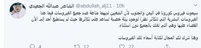 قال الشاعر عبدالله الجعيدي، اليوم، إن فيروس كورونا سيموت في الجنوب واليمن.