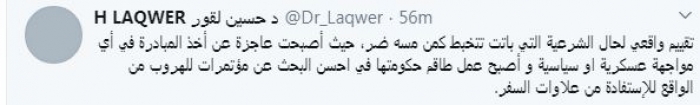 وقال في تغريدة عبر "تويتر" رصدها "المشهد العربي": "تقييم واقعي لحال الشرعية التي باتت تتخبط كمن مسه ضر، حيث أصبحت عاجزة عن أخذ المبادرة في أي مواجهة عسكرية أو سياسية و أصبح عمل طاقم حكومتها في أحسن البحث عن مؤتمرات للهروب من الواقع للاستفادة من علاوات السفر".