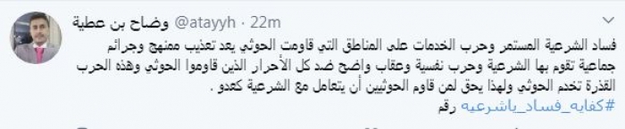 وكتب في تغريدة عبر "تويتر" رصدها "المشهد العربي": "فساد الشرعية المستمر وحرب الخدمات على المناطق التي قاومت الحوثي يعد تعذيب ممنهج وجرائم جماعية تقوم بها الشرعية وحرب نفسية وعقاب واضح ضد كل الأحرار الذين قاوموا الحوثي وهذه الحرب القذرة تخدم الحوثي ولهذا يحق لمن قاوم الحوثيين أن يتعامل مع الشرعية كعدو".