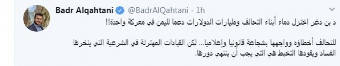 طالب الإعلامي السعودي بدر القحطاني، اليوم، بإنهاء دور القيادات الفاسدة في حكومة الشرعية.