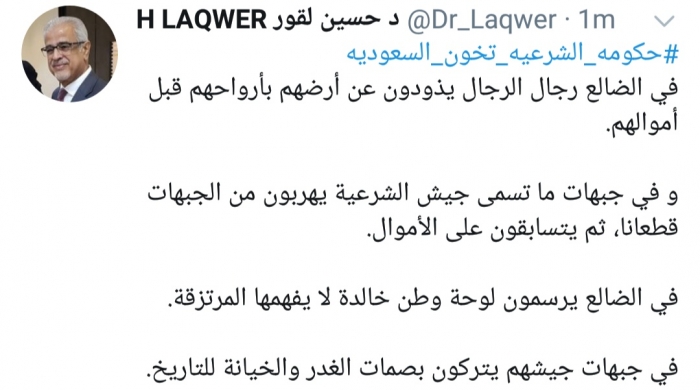 وكتب لقور، في تغريدة له عبر موقع التواصل الاجتماعي تويتر، تابعها المشهد العربي: "في الضالع رجال الرجال يذودون عن أرضهم بأرواحهم قبل أموالهم، وفي جبهات ما تسمى جيش الشرعية يهربون من الجبهات قطعانا، ثم يتسابقون على الأموال".