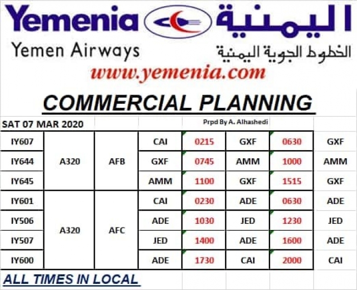 تنطلق غدا السبت، سبع رحلات جوية لطيران اليمنية، إلى القاهرة وجدة وعمان، عبر مطاري العاصمة عدن الدولي، وسيئون.