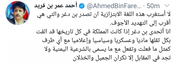 وكتب بن فريد، في تغريدة له عبر موقع التواصل الاجتماعي تويتر، تابعها المشهد العربي: "لا أستغرب هذه اللغة الابتزازية أن تصدر من بن دغر والتي هي أقرب إلى التهديد الأجوف".