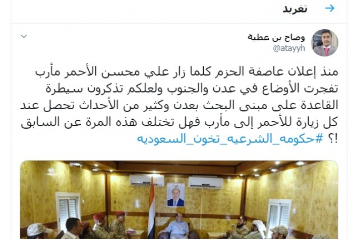 وقال بن عطية في تغريدة نشرها عبر "تويتر"، تحت هاشتاج "حكومة الشرعية تخون السعودية"، رصدها "المشهد العربي"، أنه: "منذ إعلان عاصفة الحزم كلما زار علي محسن الأحمر مأرب تفجرت الأوضاع في عدن والجنوب".