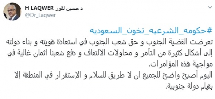 وقال، في تغريدة على حسابه بموقع "تويتر"، اليوم الجمعة، إنه: "تعرضت قضية الجنوب، وحق شعب الجنوب في استعادة هويته و بناء دولته إلى أشكال كثيرة من التآمر ومحاولات الالتفاف"، لافتا إلى: "دفع شعبنا أثمانا غالية في مواجهة هذه المؤامرات".