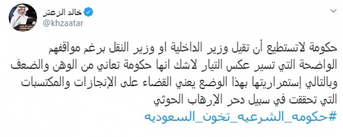 وصف المحلل السياسي السعودي خالد الزعتر، حكومة الشرعية بالوهن، والضعف أمام شخصيات تسير عكس مصلحتها.