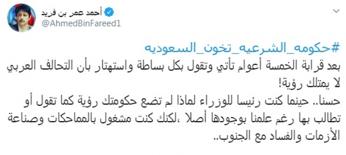 ولفت أحمد بن فريد في تغريدته إلى أن "حكومة الشرعية تخون السعودية".