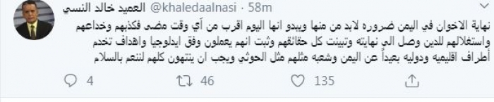 قال الكاتب والمحلل العسكري العميد خالد النسي، اليوم، إن نهاية الإخوان في اليمن أصبح ضرورة لا بد منها، مشددًا على أنه يعملون وفقاً لأهداف تخدم أطراف إقليمية ودولية.