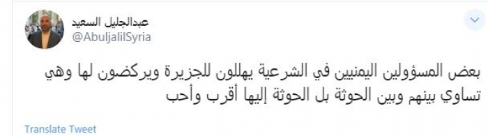 وقال في تغريدة عبر "تويتر" رصدها "المشهد العربي": "بعض المسؤولين اليمنيين في الشرعية يهللون للجزيرة ويركضون لها وهي تساوي بينهم وبين الحوثة بل الحوثة إليها أقرب وأحب".