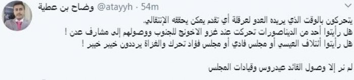 وأضاف: "هل رأيتوا ائتلاف العيسي أو مجلس فادي أو مجلس فؤاد تحرك والغزاة يرددون خيبر خيبر! لم نر إلا وصول القائد عيدروس وقيادات المجلس".