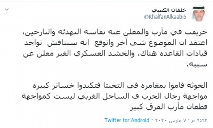 وكتب "الكعبي" في تغريدة عبر حسابه بتويتر، رصدها "المشهد العربي" قال فيها: "جريفيث في مأرب والمعلن عنه نقاشه التهدئة والنازحين، أعتقد أن الموضوع شي آخر واتوقع انه سيناقش تواجد قيادات القاعدة هناك، والحشد العسكري الغير معلن عن سببه".