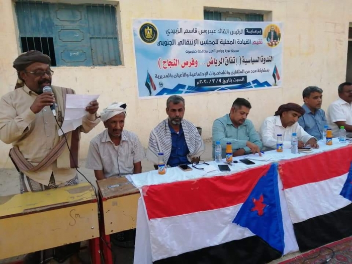 نظمت الإدارة السياسية في المجلس الانتقالي الجنوبي بمديرية حورة ووادي العين، بحضرموت، اليوم السبت، ندوة سياسية بعنوان "اتفاق الرياض.. وفرص النجاح".