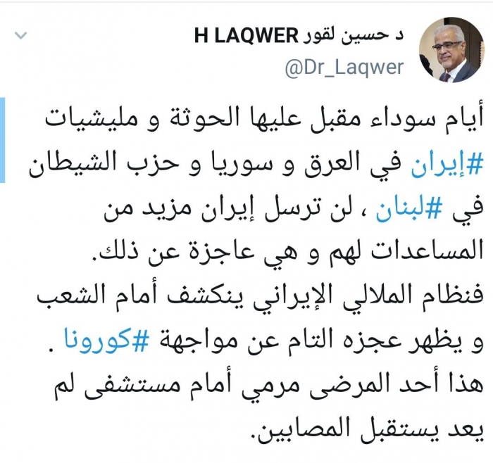 وكتب "لقور" في تغريدة بحسابه بتويتر، رصدها "المشهد العربي": "أيام سوداء مقبل عليها الحوثة و مليشيات #إيران في العراق و سوريا و حزب الشيطان في #لبنان ، لن ترسل إيران مزيد من المساعدات لهم و هي عاجزة عن ذلك".