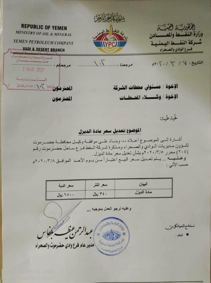 خفض أسعار الديزل في وادي حضرموت (وثيقة)