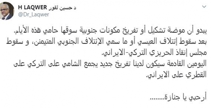 وقال في تغريدة عبر "تويتر" رصدها "المشهد العربي": "يبدو أن موضة تشكيل أو تفريخ مكونات جنوبية سوقها حامي هذه الأيام. بعد سقوط ائتلاف العيسي أو ما سمي الائتلاف الجنوبي المتيمنن، وسقوط مجلس إنقاذ الحريزي التركي- الإيراني".