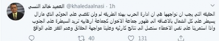 قال الكاتب والمحلل العسكري العميد خالد النسي، اليوم، إن إدارة الحرب اليمنية بتلك الطريقة لن تقضي على مليشيات الحوثي.