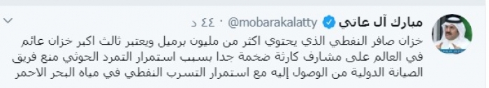 وكتب آل عاتي في تغريدة له عبر "تويتر " رصدها "المشهد العربي":"خزان صافر النفطي الذي يحتوي أكثر من مليون برميل ويعتبر ثالث أكبر خزان عائم في العالم على مشارف كارثة ضخمة جدا".