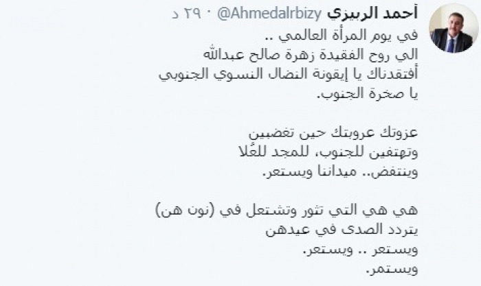 وكتب الربيزي عبر تغريدة له على "تويتر" رصدها "المشهد العربي":"في يوم المرأة العالمي، إلى روح الفقيدة زهرة صالح عبدالله، افتقدناك يا إيقونة النضال النسوي الجنوبي،يا صخرة الجنوب".