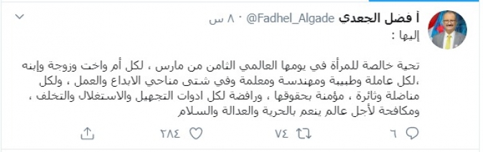 غرد عضو هيئة رئاسة المجلس الانتقالي الجنوبي فضل الجعدي، اليوم الأحد،بالتزامن مع اليوم العالمي العالمي للمرأة الذي يوافق الثامن من مارس من كل عام.