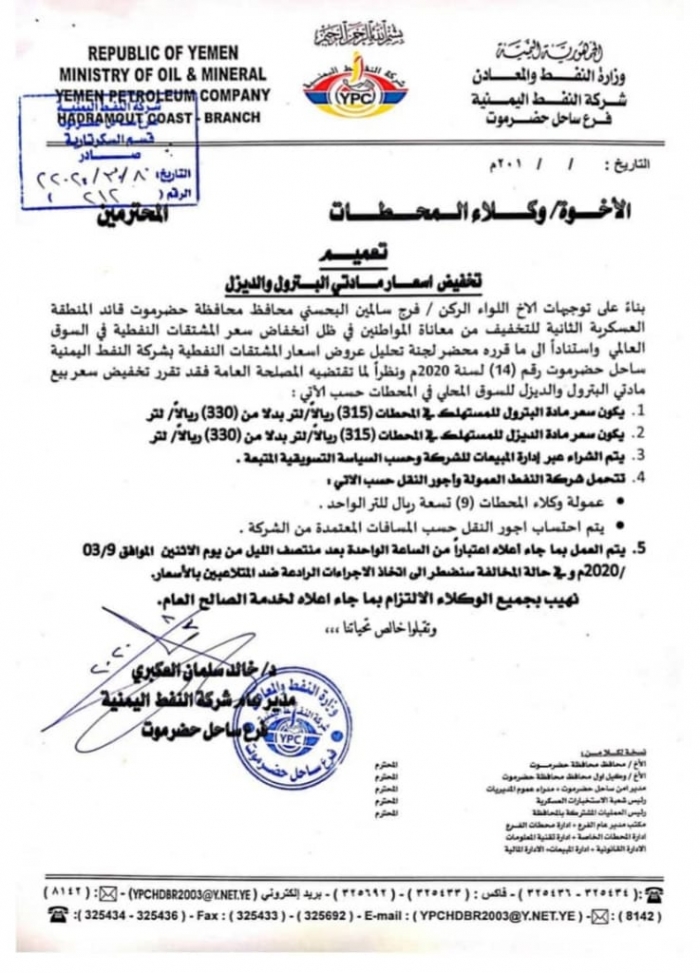 تخفيض أسعار المشتقات النفطية في ساحل حضرموت (وثيقة)