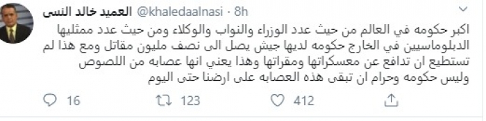 وقال في تغريدة عبر "تويتر" رصدها "المشهد العربي": "أكبر حكومة في العالم من حيث عدد الوزراء والنواب والوكلاء ومن حيث عدد ممثليها الدبلوماسيين في الخارج حكومة لديها جيش يصل إلى نصف مليون مقاتل".