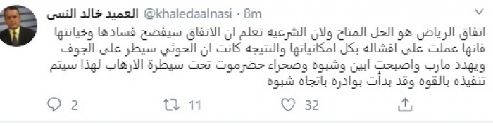 وكتب في تغريدة عبر "تويتر" رصدها "المشهد العربي": "اتفاق الرياض هو الحل المتاح ولأن الشرعية تعلم أن الاتفاق سيفضح فسادها وخيانتها فإنها عملت على إفشاله بكل إمكانياتها والنتيجة كانت أن الحوثي سيطر على الجوف ويهدد مأرب وأصبحت أبين وشبوة وصحراء حضرموت تحت سيطرة الإرهاب لهذا سيتم تنفيذه بالقوة وقد بدأت بوادره باتجاه شبوة".