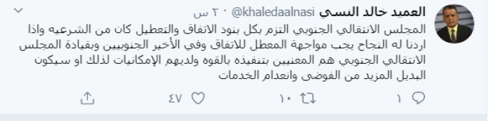 وكتب النسي عبر تغريدة له على "تويتر" رصدها "المشهد العربي":"المجلس الانتقالي الجنوبي التزم بكل بنود الاتفاق والتعطيل كان من الشرعية وإذا أردنا له النجاح يجب مواجهة المعطل للاتفاق".