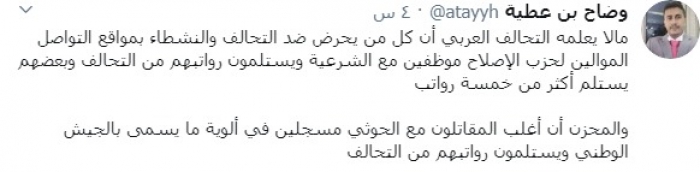 وكتب بن عطية عبر تغريدة له على "تويتر" رصدها "المشهد العربي":" مالا يعلمه التحالف العربي أن كل من يحرض ضد التحالف والنشطاء بمواقع التواصل الموالين لحزب الإصلاح موظفين مع الشرعية ويستلمون رواتبهم من التحالف وبعضهم يستلم أكثر من خمسة رواتب".