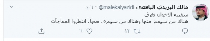 وكتب اليافعي عبر تغريدة له على "تويتر" رصدها "المشهد العربي":"سفينة الإخوان تغرق".
