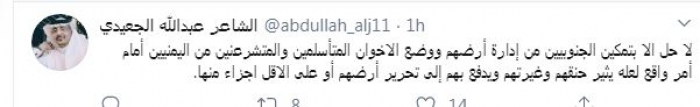 وكتب في تغريدة عبر "تويتر" رصدها "المشهد العربي": "لا حل إلا بتمكين الجنوبيين من إدارة أرضهم ووضع الإخوان المتأسلمين والمتشرعنين من اليمنيين أمام أمر واقع لعله يثير حنقهم وغيرتهم ويدفع بهم إلى تحرير أرضهم أو على الأقل أجزاء منها".