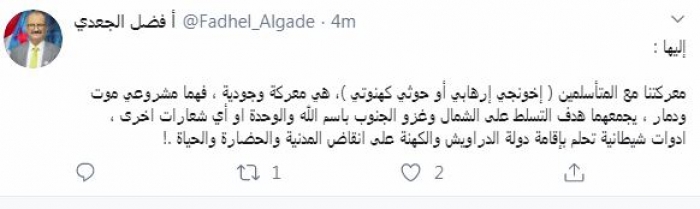 وكتب في تغريدة عبر "تويتر" رصدها "المشهد العربي": "معركتنا مع المتأسلمين ( إخونجي إرهابي أو حوثي كهنوتي)، هي معركة وجودية، فهما مشروعي موت ودمار، يجمعهما هدف التسلط على الشمال وغزو الجنوب باسم الله والوحدة أو أي شعارات أخرى".
