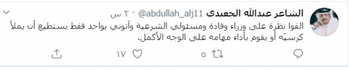 وكتب الجعيدي عبر تغريدة له على "تويتر" رصدها"المشهد العربي":"القوا نظرة على وزراء وقادة ومسئولي الشرعية وآتوني بواحد فقط يستطيع أن يملأ كرسيّه أو يقوم بأداء مهامه على الوجه الأكمل".
