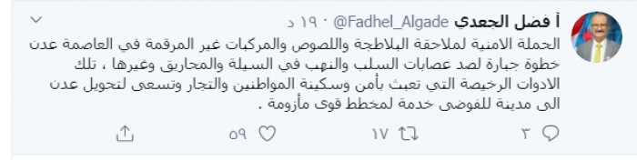 وكتب الجعدي عبر تغريدة له على "تويتر" رصدها "المشهد العربي":"الحملة الأمنية لملاحقة البلاطجة واللصوص والمركبات غير المرقمة في العاصمة عدن خطوة جبارة لصد عصابات السلب والنهب في السيلة والمحاريق وغيرها ".