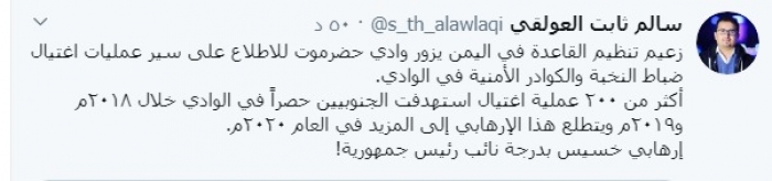 وكتب العولقي عبر تغريدة له على "تويتر" رصدها "المشهد العربي":"زعيم تنظيم القاعدة في اليمن يزور وادي حضرموت للاطلاع على سير عمليات اغتيال ضباط النخبة والكوادر الأمنية في الوادي".