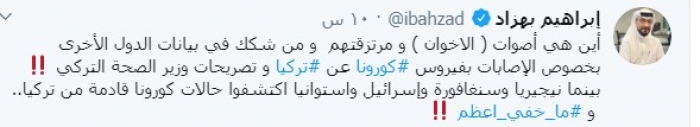 وكتب بهزاد عبر تغريدة له على "تويتر" رصدها "المشهد العربي":"أين هي أصوات ( الاخوان ) و مرتزقتهم و من شكك في بيانات الدول الأخرى بخصوص الإصابات بفيروس كورونا عن تركيا و تصريحات وزير الصحة التركي علامة تعجب مزدوجة".
