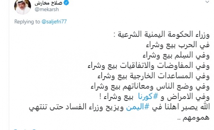 وأضاف: "وفي وضع الناس ومعاناتهم بيع وشراء وفي الأمراض وكورونا بيع وشراء الله يصبر أهلنا في اليمن ويزيح وزراء الفساد حتى تنتهي همومهم".