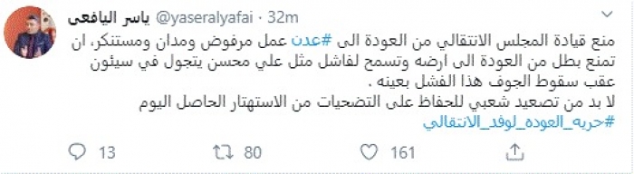 وكتب في تغريدة عبر "تويتر" رصدها "المشهد العربي": "منع قيادة المجلس الانتقالي من العودة إلى عدن عمل مرفوض ومدان ومستنكر، أن تمنع بطل من العودة إلى أرضه وتسمح لفاشل مثل علي محسن يتجول في سيئون عقب سقوط الجوف هذا الفشل بعينه".